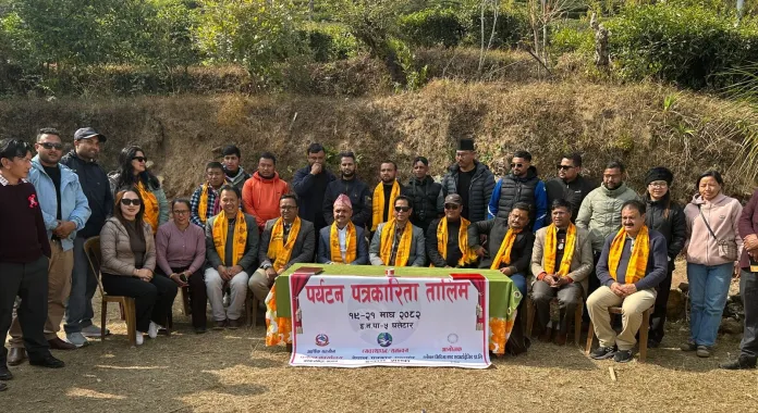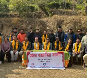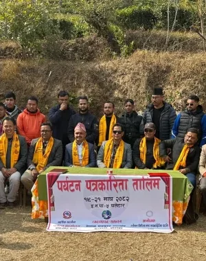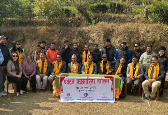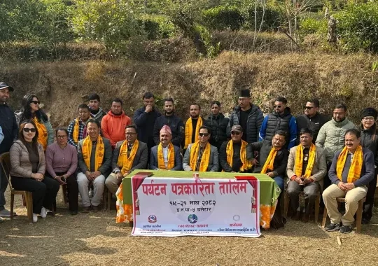 समाचारइलाममा पर्यटन पत्रकारिता तालिम सुरु, चार जिल्लाका ३० पत्रकार सहभागीMaijogmainews4 hours ago11पाल पत्रकार महासङ्घ इलाम शाखाको आयोजनामा तथा पर्यटन कार्यालय काँकरभिट्टाको आर्थिक सहयोगमा तीनदिने पर्यटन पत्रकारिता तालिम इलाममा सुरु भएको छ।...