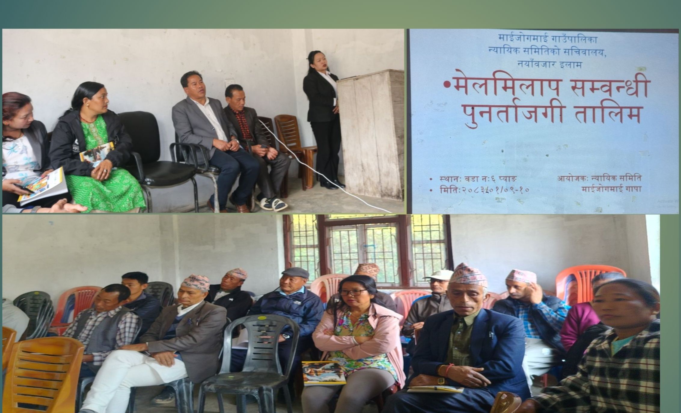 माईजोगमाई गाउँपालिका वडा नं ६ प्याङमा सम्पन्न कार्यक्रम माईजोगमाई गाउँपालिका न्यायिक समितिका संयोजक तथा माईजोगमाई गाउँपालिका उपाध्यक्ष प्रविना राईको अध्यक्षता साथै माईजोगमाई गाउँपालिका अध्यक्ष कुश बहादुर थेवेको प्रमुख आथित्यता तथा माईजोगमाई गाउँपालिका वडा नं ६ का वडाध्यक्ष दिपेश सोङ्मी , कार्यापालिका सदस्य राम कुमारी परियार को विशेष आथित्यता तथा वडासदस्यहरू , सिता खालिङ , बिजय प्रसाद थेवे , माईजोगमाई गाउँपलिका उजुरी प्रशाशक श्याम सेम्बो , ईलामका न्यायधिवक्ता तारा घिमिरे, वडाका टोल बिकास समितिका पदाधिकारीहरू , वडाका मेलमिलापकर्ताहरू लगायतको उपस्थितिमा प्याङमा पुनर्ताजकी तालिम सम्पन्न भएको हो । माईजोगमाईको वडा नं ५ वडा नं २ र वडा नं १ मा समेत निरन्तर रूपमा यो तालिम संचालन रहने समेत उजुरी प्रशाशक श्याम सेम्बोले जानकारी दिनुभयो ।